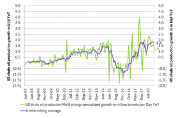 From end 2016 to end 2018 the US has increased its hydrocarbon liquids supply by 4.2 m bl/d consisting of 2.9 m bl/d of crude and 1.3 m bl/d non-crude (typically NGL’s). The later typically contains no medium to heavy molecules while the prior contains 59% such molecules or less. In total the 4.2 m bl/d of new liquids supply in the US has added 1.7 m bl/d of medium to heavy molecules or 0.4 m bl/d per m bl/d of additional US liquids. “Black crude” however typically contains close to 78% medium to heavy molecules.