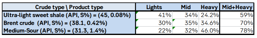 US shale oil typically contains about 60% medium to heavy molecules. But if we also factor in the added supply of US liquids which is NGLs etc. which contains 0% such molecules then the total comes down to only 40%. I.e. average new liquids supply in the US only contains a 40% cut on average of medium to heavy molecules.