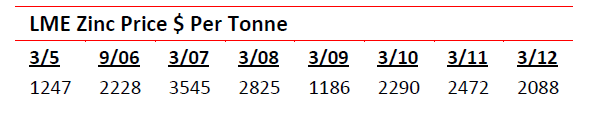 Effectively it is 45% below and 79% above, its 7 year top and bottom. The most exposed countries are China and the USA as exporters/importers whilst the company most at risk will be the combined Xstrata/Glencore combine with 15% of mined production and a dominant position in both refining and trading. We see no rapid recovery for zinc, but maybe Glencore does. It has reportedly signed a deal to buy concentrates from Peru’s Volcan (2.8% of world output) for processing without charge, presumably in the hope that the metal price will rise. This is not an unknown stratagem but faith plays more than a walking on part.