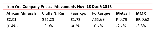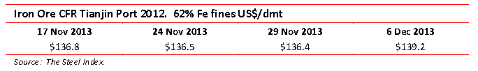 Chinese imports of iron ore, perhaps more correctly, Australia exports, are on the up. Port Headland, which handles up to a fifth of all seaborne trade, saw an increase in exports of 38%, year-on-year, in November 2013. 22.3Mt went out in the month. Japan to 2.2Mt (also up 38%) and Korea doubled to 2.9Mt. The port handles cargoes for BHPB, Fortesque and Atlas.