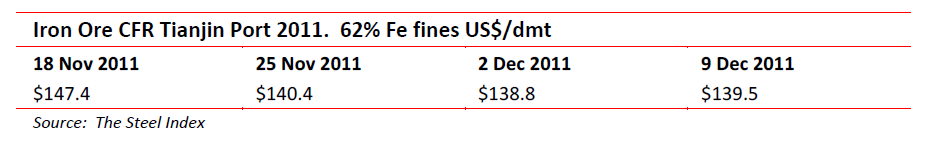 Iron Ore Pricing. We have long advocated a clearing house system for iron ore, based on the LME format. Opponents argue it would be too difficult. So were aluminium and nickel before someone did it. Now the world’s largest producer, Vale SA of Brazil (24% of world total), is edging closer. It is to base its quarterly contracts on “actual averages” on spot prices, not lagging ones. On that basis, prices will be 20% lower Q4 than Q3 2011, but that’s show business. It makes the spot price truly relevant.