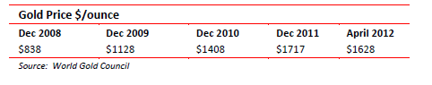 India holds the aces. Panic-buying propels most gold price surges and when the panic subsides, so does the gold price. Steady purchases underpin a base price. India imports around 900tpy, over 35% of all new production. This is from a country with a c.17% of the world’s population and less than 5% of its GDP. It is a habit which will not easily be broken, but it is seriously worrying the government. So, in January, it upped the import duty, first from 1% to 2% in January, then to 4% in March. As a result, imports fell 55% in Q1 coincident with a jewellers’ strike. Gold fabrication is a major trade in the country and these moves are also hitting silver. Gold imports were noted as 90 tonnes in January-March as opposed to 280 tonnes in Q1 2011. Q2 purchases are also called down, at perhaps 150 tonnes against 250 in 2011. The concern of course is that the general population pours into gold what could otherwise be flowing into investment and industry. The Associated Chambers of Commerce and Industry warn that imports could reach $100bn by 2015-16 unless they are arbitrarily slowed. That is an almost unthinkable 2000 tonnes at current prices.