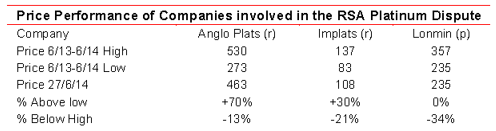 Platinum celebrated the end of the longest and costliest strike in South Africa’s history with militant union AMCU declaring “a victory”. Well, they would, wouldn’t they? Over the week, the price edged up a notch, $23 or 1.6% to $1479/oz. What now? To the immediate we have the share prices of the three involved companies: