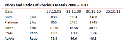 Whilst the EU/Eurozone one is normally the strongest bloc, it is currently struggling to stay alive and would hardly put itself up as the world reserve currency right now. China is wisely content to maintain a fixed parity to the dollar. The others do not have the volume singly and the possibility of their combining is non-existent. So George Washington it is. Now a strong dollar rarely betokens strong gold. So let’s beware the runaway prophets. Not that this will necessarily stop them, GFMS, no less, says investment demand will push silver over $50/oz by late 2012. So far this year it has been a not-soshabby $36. It admits there will be a production – to – consumption surplus, but investment will take up the slack. It forecasts 278Moz from that sector in 2011. Other commentators warn that silver’s very volatility holds its back. It topped $50/oz earlier this year yet slid over $20 in one trading hit. Not good for the digestion.