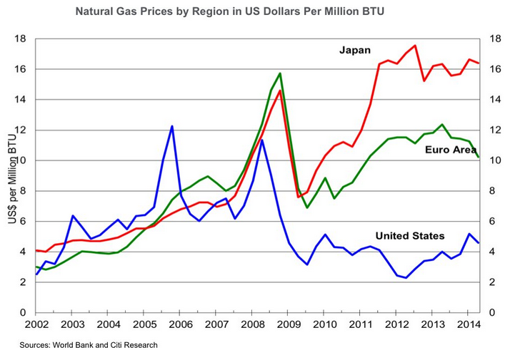Nedanstående diagram visar naturgasprisets utveckling från 2002 till idag, för USA, Europa och Japan. Till en bit in på 2008 följer priserna varandra åt ganska väl och vi ser en topp då alla råvarupriser lyfte mot himlen. Men sedan ser vi hur USAs fracking-revolution tar fart och priset i USA kopplar sig loss och lägger sig på en långt mycket lägre nivå. Det är inga små procentuella skillnader vi tittar på idag. Priset i Europa är över 100 % högre än i USA, och i Japan 200-300 % högre. Det låga priset i USA är en stor bidragande orsak till att deras ekonomi nu växer stadigt, medan Europa vobblar och Japan står still.