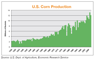 Grafen nedan visar den genomsnittliga majsproduktionen hos de amerikanska bönderna sedan 1928, mätt i bushels per acre. Data från det amerikanska jordbruksverket, USDA, visar att den genomsnittliga skörden under perioden 1866 till och med 1939 låg på cirka 26 bushels per acre, för att sedan öka dramatiskt under 1940-talet, främst som en följd av införandet av hybridfrön, ett ökat användande av gödningsmedel och bättre mediciner. Under 2009 uppgick den genomsnittliga majsproduktionen hos de amerikanska bönderna, mätt i bushels per acre till 165 bushels per acre, en ökning på otroliga 634 procent. Under 2010 föll samma siffra till 153 bushels per acre och spås uppgå till 148,1 bushels per acre under 2011.