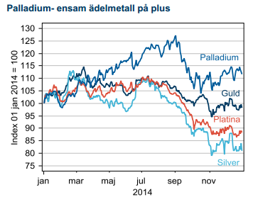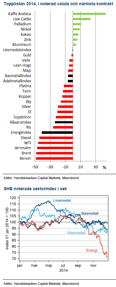 För andra året i rad slutade samtliga fyra råvarusektorer; livsmedel, energi, basmetaller och ädelmetaller på minus. En förstärkning av USD mot SEK med 17,4% hjälpte de SEKnoterade indexen men räckte inte till för positiv avkastning. Råvaror som slutade året på plus var det ont om men tre av sex basmetaller slutade upp med nickel som vinnare i sektorn. Även här är det utbudsdramatik som ligger bakom prisrörelsen när Indonesien införde exportförbud för bland annat nickelmalm, vilket minskade världens utbud med 20%. Marknaden har betat av lager och står nu inför nickelbrist under 2015. Årets vinnare var, precis som vanligt, en väderdrabbad jordbruksråvara; kaffe från torkans Brasilien.
