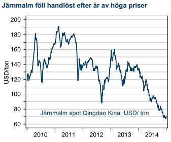 Kinas extrema hunger på stål kom till ett abrupt slut under 2014. Året började med en inhemsk tillväxttakt i stålkonsumtion på 7% och slutade på -3%. Samtidigt kom resultatet från år av investeringar i ny gruvproduktion. Produktionen av järnmalm för exportmarknaden växte med 12% när Rio Tinto, BHP Billiton, Vale och Fortescue ökade kapaciteten. Efterfrågan ökade samtidigt blott med 9% när inhemska kinesiska järnmalmsgruvor inte stängde ner sin olönsamma högkostnadsproduktion i den utsträckning marknaden förväntat sig. Överskottet pressade priset och de stora bolagen som en gång formade ett oligopol blev anklagade för att förstöra marknaden. De försvarade sig med att strategin var att hindra marginalproducenter före de anträder marknaden. Året såg också flera konkurser bland nyetablerade marginalproducenter, inte minst i Sverige.