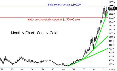Oavsett om du är en trader eller en långsiktig placerare gäller regeln ”the trend is your friend”. Den långsiktiga trenden är fortfarande positiv och det finns inga tekniska indikatorer som tyder på att detta kommer att förändras inom en snar framtid. Vägen för minsta möjliga motstånd kommer under de närmaste månaderna att vara sidledes till högre och det signaler som finns tyder på att guldet kommer att stiga över 2.000 USD per troy ounce under 2013.