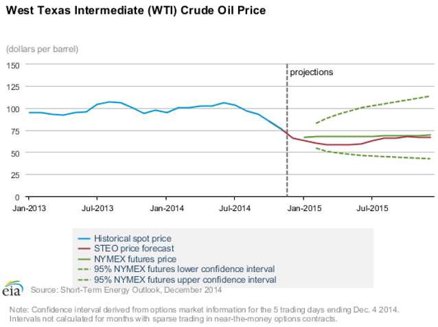 U.S. Energy Information Administration, EIA, tror på ett fortsatt lågt oljepris år 2015. I sin senaste prognos spår EIA att priset på West Texas Intermediate (WTI) kommer att handlas till i genomsnitt 75 USD det fjärde kvartalet 2014, ett kvartal som nästan är slut. Prognosen för 2015 ligger på ett genomsnittligt oljepris om 63 USD per fat.