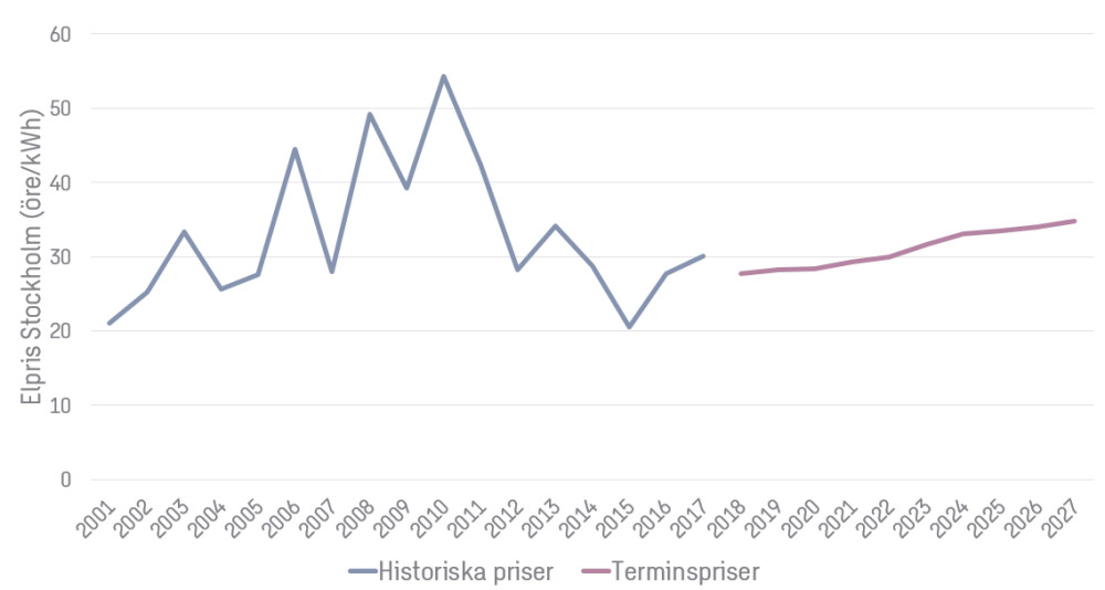 - I Stockholm var genomsnittspriset 2017 30 öre/kWh, att jämföra med snittpriset 2001-2017 på 33 öre/kWh.