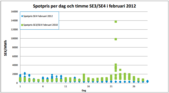 Den 22:a februari 2010 var vädret 10 grader kallare än normalt i hela Norden och kärnkraften levererade 60 % av maximal kapacitet. Dygnets raka spotmedelpris var över 7200kr/MWh och timmarna mellan kl. 08 till 11 kostade alla 13756kr/MWh (se graf 3). Februari 2010 i SE3 är därför med sina 59kr/MWh den månad som haft den högsta profilkostnaden. Motsvarande utfall i SE4 var 30kr/MWh.