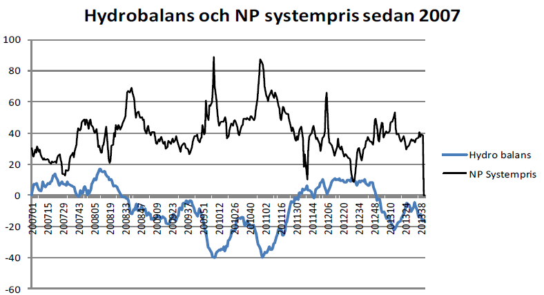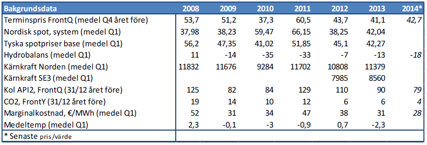 Vi har idag en hydrobalans (inkl. 10 dagars prognos) på ca -18 TWh. Skulle vi utgå från att hydrobalansen blir ca -15 TWh under Q1-14 så har vi två år bakom oss att titta på: 2009 och 2013. Båda dessa år var marginalkostnaden för kol något högre än prognoserna visar idag; ca €31/MWh mot dagens ca €28/MWh. Vi borde alltså, fundamentalt med dessa traditionella faktorer i bakgrunden, få något lägre priser i Q1-14 än vi hade under dessa två år. Terminspriset ligger idag dock ca €5/MWh högre än utfallet i Q1-09 och ca €1/MWh högre än utfallet i Q1-13. Vi hade under dessa år en mycket hög tillgänglighet på kärnkraft så för att det här ska stämma så måste också kärnkrafttillgängligheten ligga runt 90% under första kvartalet 2014. Vi har haft en del strul med kärnkraftkraften och nu har vi en tillgänglighet på drygt 80%, vi bör dock vara uppe i 90% när Ringhals 3 kommer in till november. Detta är dock en osäkerhet som bör speglas i priset vilket gör att det är rimligt att vi ligger lika eller till och med någon euro över utfallet Q1-09 , alltså som vi gör idag.