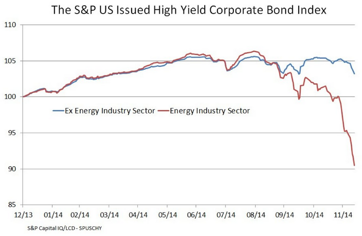 Oljepriset har rasat omkring 50 % det senaste halvåret och en följdeffekt är att priserna på energiföretagens obligationer i USA rasar, närmare bestämt på de energiföretag som gett ut obligationer med hög ränta. Nedan kan vi se S&P US Issued High Yield Corporate Bond Index, där utvecklingen delats upp i två grafer, en med alla företag förutom energi, och en med bara energiföretag.