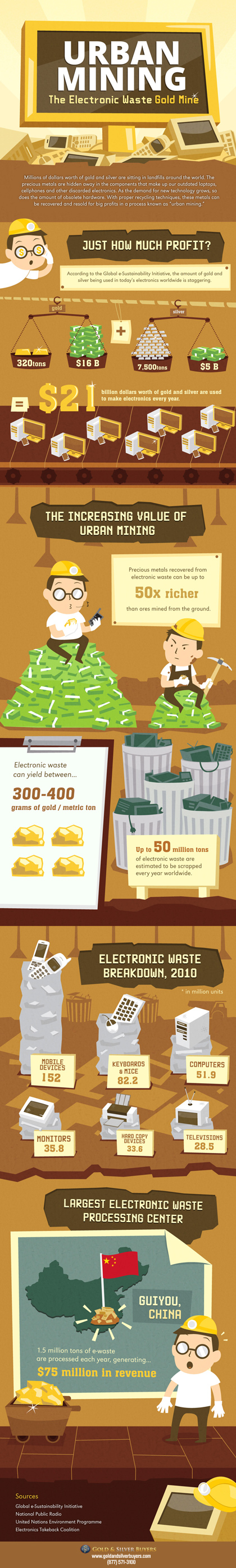 Den elektronik vi alla använder innehåller många metaller. Det är inga stora mängder ädelmetaller som guld och silver i en enskild apparat, men aggregerat på global nivå så blir volymen betydande. Varje år används guld och silver för 21 miljarder dollar i olika former av elektriska apparater, så som mobiltelefoner, tv-apparater och datorer.