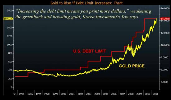 En intressant bild som visar på korrelationen mellan guldpriset och USA:s skuldtak. Källa: www.wealthson.com