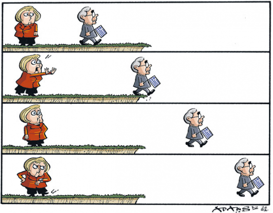 Situationen i dagens skuldkris kan nästan liknas vid den konstpaus som inträffar då tecknade figurer går ut för ett stup. ECB försöker förgäves att motverka den negativa gravitation som uppstått i en obalans mellan produktion och konsumtion, och det återstår att se om ECB och IMF klarar av att mjuklanda drabbade ekonomier utan kraschlandning.