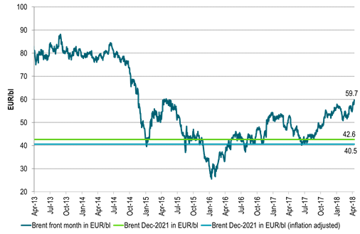 Adjust the Dec-2021 price for 8.3% cumulative inflation and get a real price of $54.4/bl. Then adjust for market pricing in an 11% weakening in the USD vs the euro to Dec-2021 and we get a real, inflation adjusted and fx adjusted forward Dec-2021 Brent price of only $48.6/bl