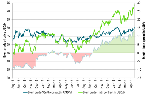 Brent crude oil is ticking higher by the day as OPEC+ cuts are intact, global oil demand growth is firm (though global economic growth rates seems to have peaked), Venezuela oil production is in a death spiral, renewed Iran sanctions are imminent (May 12) and sanctions towards Russia on oil and not just Aluminium is possible. Yesterday Brent crude oil hit $74.75/bl and highest since mid-2015. Barring a global recession we think there is more room on the upside and as we stated in early march: If OPEC+ sticks to its cuts we are likely to see $85/bl later in the year as inventories draw lower. While we are bearish long term oil prices due to technology and increasing competitive pressure beyond 2025, we are cyclically bullish for the time horizon up to that point. In this view it is staggering how cheaply you can purchase crude oil on the forward curve. Not just in relative terms to where the front month Brent crude oil price is trading but also in a more absolute perspective versus historical prices. The most accentuated gains in the oil price have taken place at the front end of the forward curve. Yesterday the Brent crude front month contract closed at $73.78/bl (+0.4%) which was 25% above the Brent Dec-2021 contract. But if you inflation adjust the Dec-2021 contract then the front month contract yesterday closed 36% above the real Dec-2021 price of $54.4/bl. If we also adjust for the fact that the market is pricing in an 11% forward weakening of the USD vs the euro to Dec-2021 we get that the front month Brent contract yesterday closed 51% above the real, inflation adjusted and fx adjusted forward Brent Dec-2021 crude oil price. It is staggering cheap. Run and buy it before it ticks higher along with higher front end prices. Because that is what always happens.