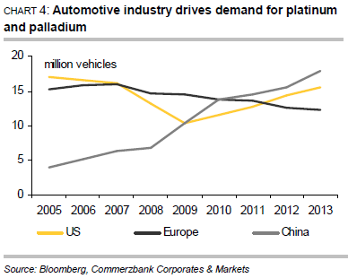 Driven by the automotive industry, demand for both platinum and palladium is robust. March saw the seasonally adjusted annualized vehicle sales rate in the US rise to 16.33 million units, the highest figure since May 2007. At 3.16 million units, car sales in China in January and February combined were a good 11% up on the same period last year. It would therefore seem that the 2014 target of an increase in sales of up to 10%, set by the China Association of Automobile Manufacturers, is achievable. The European auto industry may also have bottomed out, for car sales in February increased year-on-year for the sixth consecutive month (Chart 4).