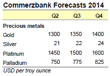 In our opinion, risks to supply in conjunction with robust demand point to higher platinum and palladium prices. According to data from Johnson Matthey, the supply-demand situation was already tight on both markets last year, the global platinum market showing a supply deficit of 605,000 ounces in 2013 and demand outstripping supply on the global palladium market by 740,000 ounces. Assuming the supply problems are not resolved in the near future and demand remains robust, the situation on both markets will doubtless tighten further. By year’s end we continue to envisage a platinum price of $1,600 per troy ounce, while palladium is likely to be trading at $825 per troy ounce.