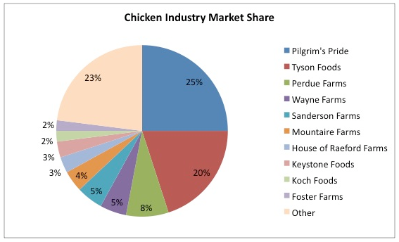 Företag som Pilgrim’s Pride (PPC) och Tyson Foods (TSN), är exempel på stora kycklingproducenter (de har 25 % och 20 % marknadsandel på den amerikanska marknaden), gynnas när priset på kyckling stiger.