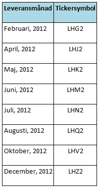 *2 avser årtalet, vilket betyder att tickern LHG2 avser leverans av fläskkött i januari 2012.