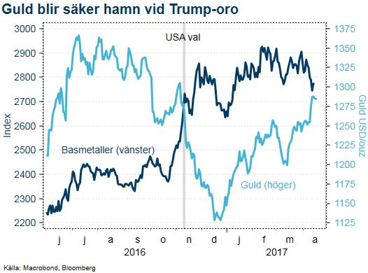 Förra veckan steg guld 2,5 procent samtidigt som industrimetaller föll i pris. Vad som håller på att hända är att mönstret efter amerikanska valet reverserar. Då gynnades industriråvaror på Trump:s utspel om ökade stimulanser och reformer som gynnar byggnation.