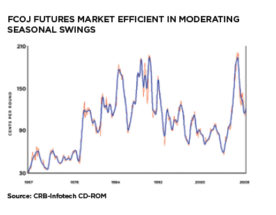 Prishistorian och marknadsstrukturen visar tydligt varför dagligvarukedjor och juiceprocessorer behöver säkra sina priser och varför termins- och optionskontrakt på FCOJ har varit så pass framgångsrika sedan dessa introducerades.