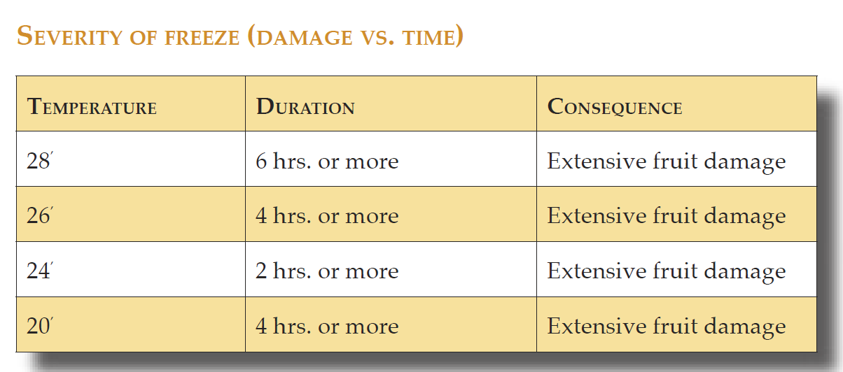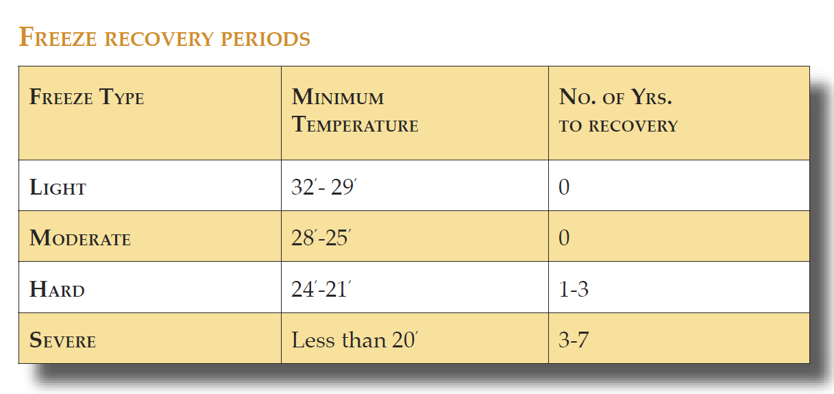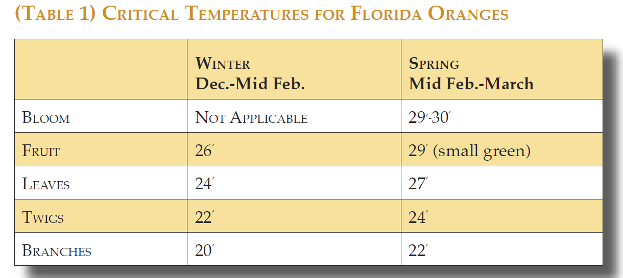 Nedanstående tabeller visar vilken påverkan frost kan komma att ha på apelsinodlingarna i Florida.