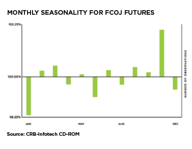 En säsongsbetonad analys tyder på att den starkaste månaden för FCOJ-terminer är november, den period då handlarna hedgar sig mot frosten. Den säsongsmässigt sett svagaste månaden är januari, en månad då det är vanligt att dessa frosthedgar stängs.