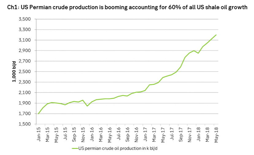 Permian production growth probably has to slow to only 30% of current growth pace. That means an overall US shale oil production growth of about 1.0 m bl/d over the coming year. That is 0.5 m bl/d lower than our current projection. It means a tighter global oil market and that is bullish for Brent crude oil prices. Permian can however probably still grow at around 25 k bl/d/mth versus today’s 80 k bl/d as trucks and trains and more pipelines probably will allow this kind of growth pace.