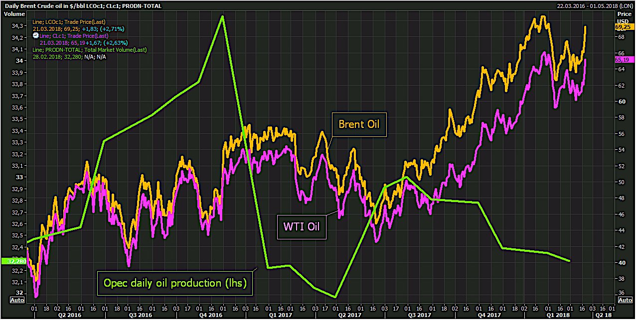 Graf över brent- och wti-pris, samt OPECs oljeproduktion