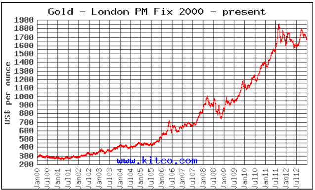 My final wish for this issue is that all of you, my highly valued international audience, will continue to follow these developments and my editorials on the fascinating and exciting markets of gold, other metals and international mining and exploration companies. During the last 10 years, I have been positive about the growing attractiveness of gold as a basic investment and judging from the price chart on the next page, that was rightfully so and very well-timed. I am confident that also in 2013 and beyond, I can keep myself busy with writing about the successful performance of gold and other remarkable subjects of interest and value. The past year showed a very satisfying expansion of my audience, in quality, quantity and geographic coverage. I wish for a continuation thereof.