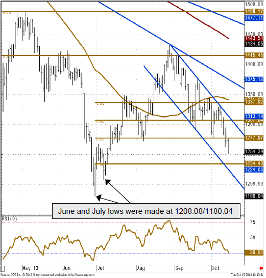 - The first downside target is the 78.6% Fibonacci retracement of the June-to-August advance at 1234.40 but the next lower June and July lows at 1208.08/1180.04 represent more significant targets for the weeks to come.