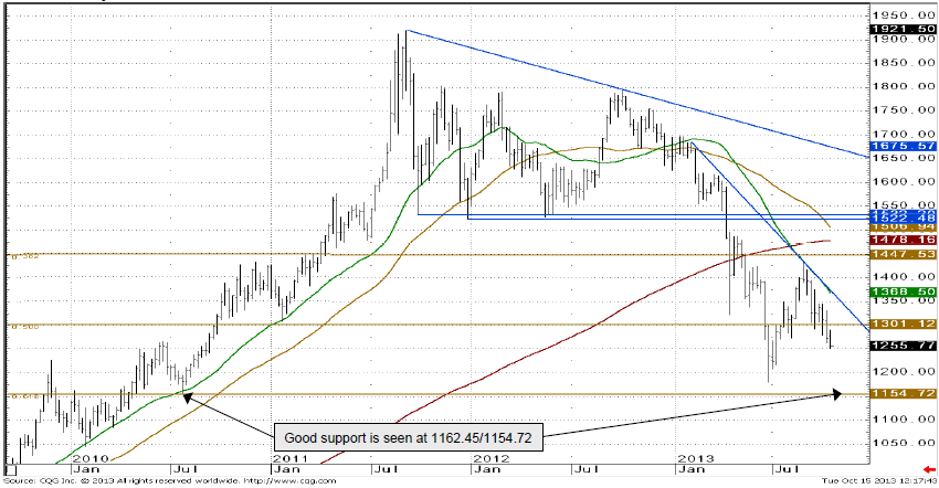 - ’The long term downtrend is expected to take the gold price to the 1162.45/1154.72 support zone, made up of the January 2010 high, July 2010 low and the 61.8% Fibonacci retracement of the 2008-11 uptrend.