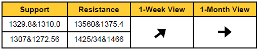 - For our short- and medium term outlook to once again become bullish we would like to see at least two daily closes above the 2013 resistance line at 1360 being made this week.
