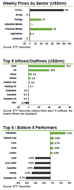 Long oil ETP inflows rise to US$41.7mn, the highest in eight weeks as lower prices continue to attract investors. While long Brent ETPs have seen 10 consecutive weeks of inflows, long WTI ETPs are now starting to receive interest with US$11.9mn flowing in last week to add to the US$2.1mn the week before. The WTI benchmark slipped 5% over the past month, despite numerous conflicts in oil exporting countries still raging. Investors have been buying into the recent price dip as supply could tighten quickly if these conflicts remain unresolved for too long. Flows into Brent ETPs rose to US$29.8mn, as many perceive this benchmark to react more strongly to non-US geopolitical events.