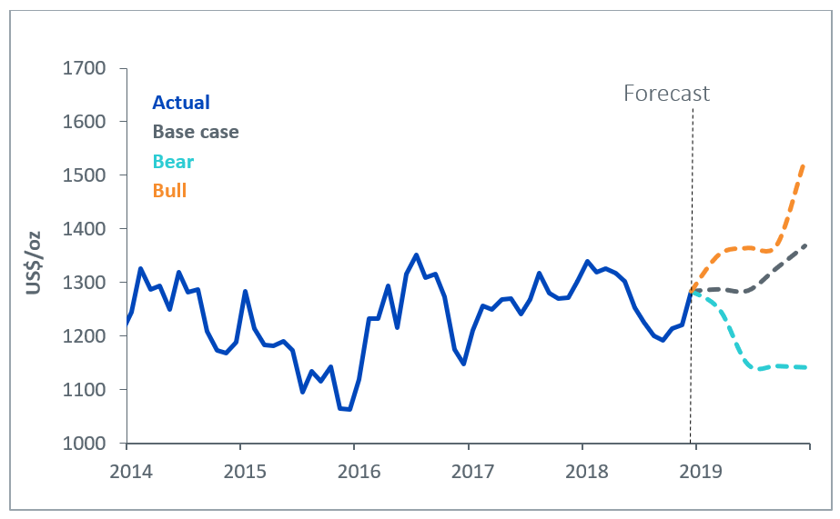In our base case scenario, we expect gold prices to rise close to US$1370/oz by Q4 2019, mainly as a result of speculative positioning in the futures market being restored. Some US Dollar depreciation and small gains in inflation will also aid gold’s rise.
