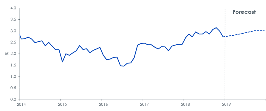 US consumer price index (CPI) inflation peaked at 2.9% in July 2018 and declined to 2.2% in November 2018. Volatile energy prices were responsible for a large part of the rise and decline. We expect the Fed’s policy tightening to continue to keep demand-driven inflation in check, but a recovery in oil prices will likely place upward pressure on inflation at the headline level. We expect a small increase in inflation to 2.3% by year-end.