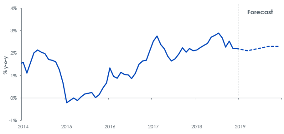 US consumer price index (CPI) inflation peaked at 2.9% in July 2018 and declined to 2.2% in November 2018. Volatile energy prices were responsible for a large part of the rise and decline. We expect the Fed’s policy tightening to continue to keep demand-driven inflation in check, but a recovery in oil prices will likely place upward pressure on inflation at the headline level. We expect a small increase in inflation to 2.3% by year-end.