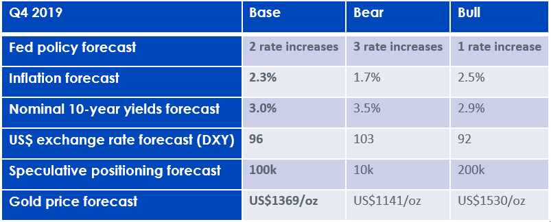 Using the framework we outlined in our paper Gold outlook: gold to flatline out to June 2019 in the absence of shocks, we apply our views on inflation, exchange rates, interest rates and investor sentiment to try to project where gold will be by the end of the year.