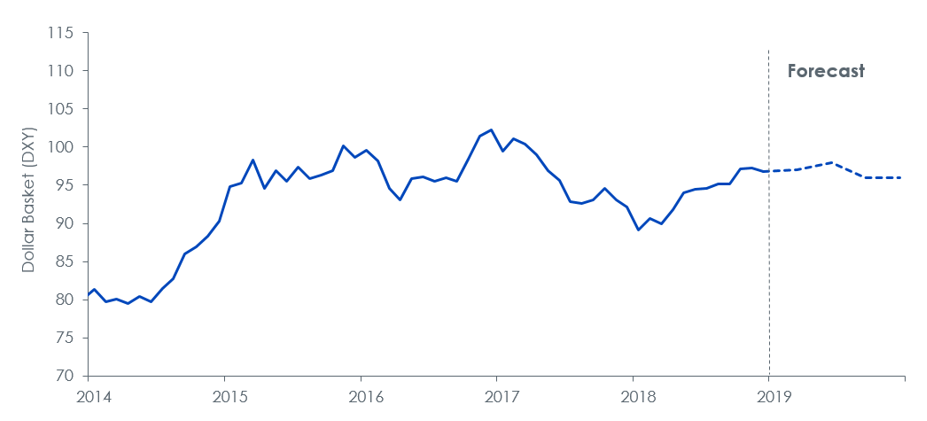 Although we expect a total of 50 basis points increase in policy rates by Q4 2019, we think that 10-year bond yields will only increase around 25 basis points to 3.0% in that time horizon. 2-year bond yields are likely to capture more of the gains in policy rates, but further out in the curve, we are likely to see less yield increases. That’s because the Fed’s holding of a large stock of bonds is likely to hold yields back from rising too aggressively. Also, recent tax cuts are likely to have the most impact in the very short term. As the growth impact peters out over longer horizons, the uplift to yields at the longer end of the curve will be less than at the short end. Although many people see yield curve inversion as a financial signal of impending economic downturn, we believe that an inversion can occur for the less benign reasons outlined above and so it is not necessarily a precursor to an economic recession. If anything, we believe the Fed will err on the side of dovishness, as it will be reluctant to drive policy too far from other central banks. In fact, Fed fund futures indicate that the market thinks that the Fed will stop raising rates altogether this year. That could prove to be supportive for gold prices over the course of 2019.