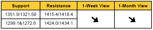 - Our first downside target is the 1351.86/1321.50 support area which consists of a support line, the July high, April and May lows and the 55 day moving average. Below it lies the 1272.56 August low which is also being targeted.