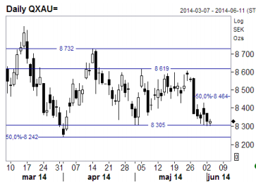 Ett kraftigt prisfall i guldet noterades (lite överraskande måste medges) i förra veckan. Den generella rangen (8 305\8 620, eller till och med 8 240\8 730) gäller fortfarande, men den nedre änden av detta intervall har nu kommit under press och så länge marknaden inte orkar klättra tillbaka över 8 465, så är risken uppenbar för ett brott lägre.