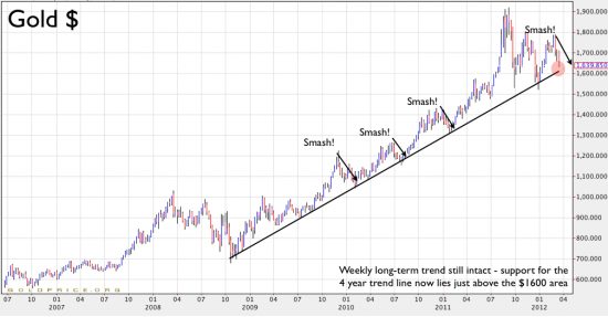 I tvetydiga perioder brukar säljmentaliteten regera, men det är intressant att notera att även om guldet bottnade vid 1642 USD/uns så har 5-årstrenden visat att utvecklingen är konsekvent med den nivå stödlinjen har satt (under mars månad låg den vid 1600 USD/uns), något som visar sig extra tydligt när guldet är prissatt i euro eller brittiska pund.