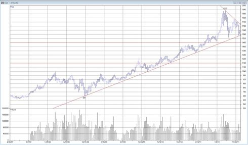 Vi ser i veckodiagrammet att den stigande trendlinje, som har sitt ursprung så långt tillbaka i tiden som oktober 2008, testades denna månad igen. Den höll, precis som sig bör, för ett första test.