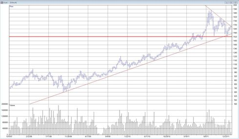När vi analyserade guldet den 27 december var priset 1608 USD/oz och vi konstaterade redan då att guld blivit ett osäkert kort. Skulle den stigande trendlinjen på veckobasis (se diagrammet) ge vika, kunde vi räkna med nedgångar mot 1460 USD/oz i första hand, med 1160 USD/oz som ett mer negativt alternativ.
