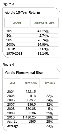 Följande diagram visar guldprisets utveckling i tioårscykler och den årliga avkastningen för de senaste åren: