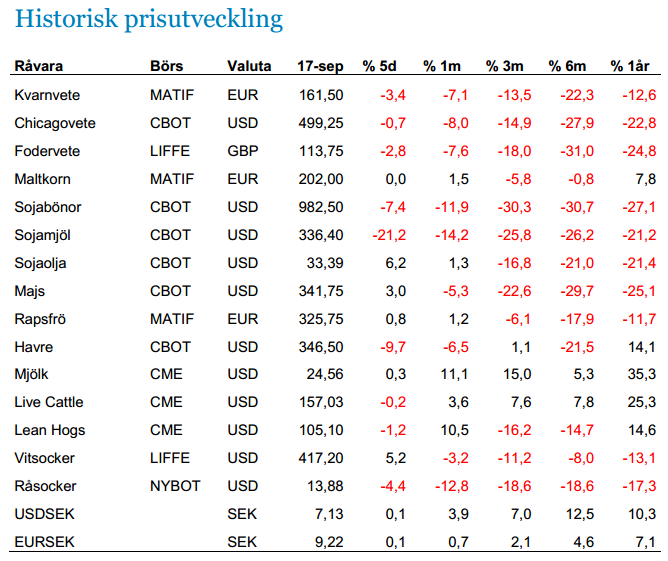 Priserna i Chicago på sojabönor noteras i stort sett oförändrade sedan förra veckan. Hela växtsäsongen har hittills präglats av nära nog idealiskt väder för den amerikanska sojan och förväntningarna på kommande skörd är fortsatt väldigt hög – hela tiden inkommer rapporter om mycket hög avkastning. Senaste dagarna har gett varmare väder vilket minskat oro för frost och risken för väderrelaterade bakslag blir allt kortare. Tills ett eventuellt väderproblem dyker upp i Brasilien, där skörden startar efter årsskiftet, är det för tillfället svårt att se varför sojapriser ska vända uppåt. Vi tror snarare att den höga avkastningen kan pressa ned priserna ytterligare något – även om nedsidan nu känns mer begränsad.